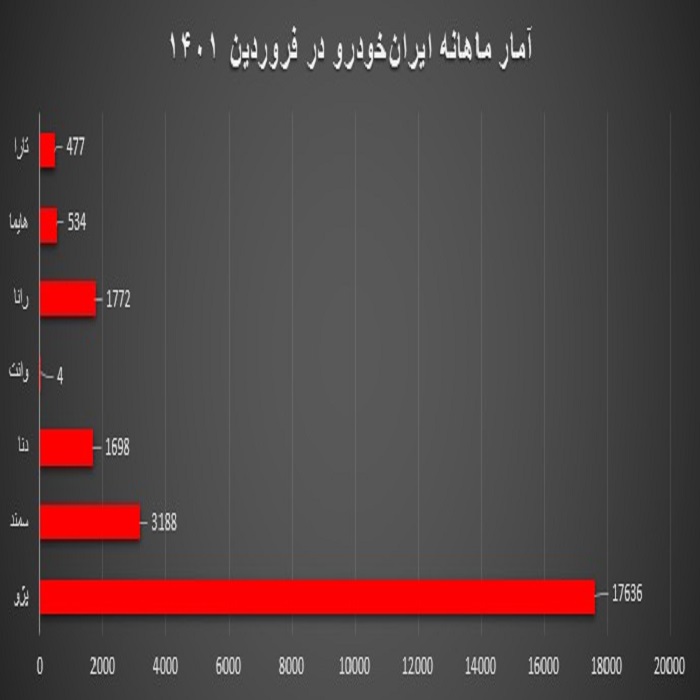 در نمودار زیر که جزو تازهترین آمارهای سال جاری به حساب میآید تعداد تولید هر خودرو را به تفکیک آوردهایم. همانطور که مشاهده میکنید بیشترین تولید ایرانخودرو در فرردین ماه پژو با ۱۷۳۶۸ دستگاه بوده است. رتبه بعدی در این نمودار متعلق به سمند و رانا با تولید ۳۱۸۸ و ۱۷۷۲ دستگاه بوده است. همچنین کم تعدادترین خودروی تولید شده با ۴ عدد متعلق به وانت است. میتوان گفت ایرانخودرو در مجموع بیش از ۲۵ هزار دستگاه پژو، رانا، دنا، سمند، هایما و تارا تولید کرده است.