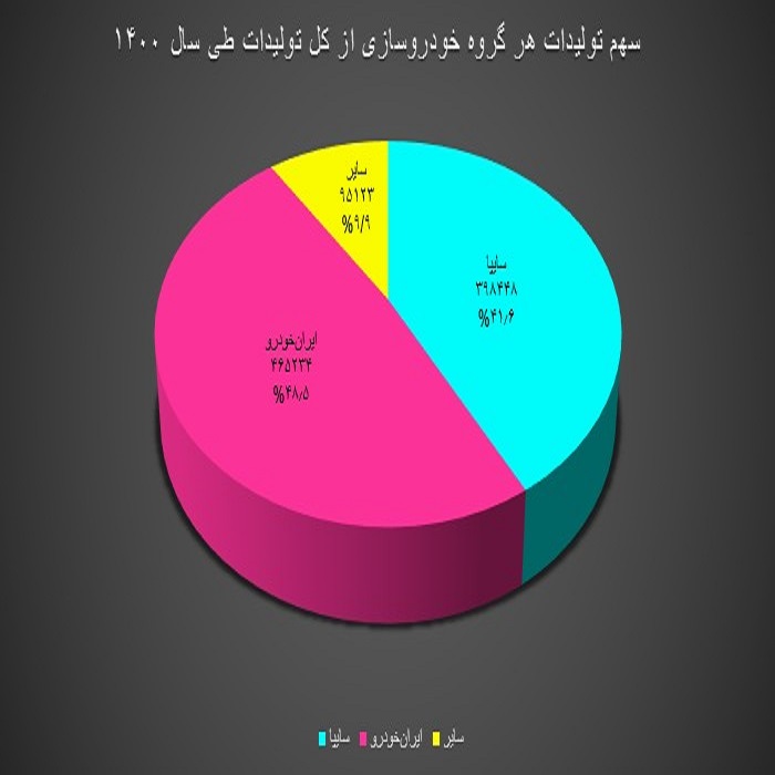 در نمودار زیر ما میزان تولیدات هر گروه خودروسازی از کل تولیدات سال ۱۴۰۰ را آوردهایم. از آنجا که عمده تولیدات متعلق به دو گروه سایپا و ایرانخودرو است این دو شرکت به تفکیک گزارش شدهاند.