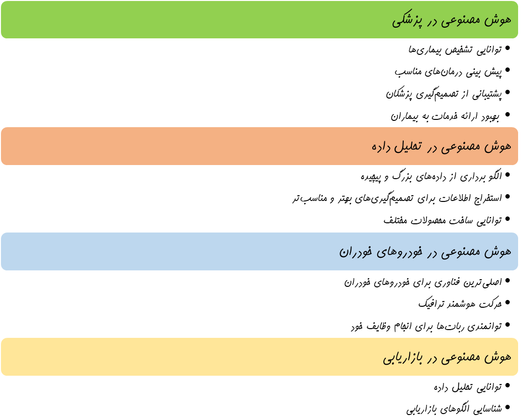 پیش از آنکه به بررسی تکنولوژی هوش مصنوعی در ایران بپردازیم، باید درباره کاربرد این تکنولوژی در زندگی بشر اطلاعات کاملی داشته باشیم. به صورت کلی هوش مصنوعی به عنوان یک تکنولوژی نوین در حال حاضر در صنایع مختلفی مانند موارد زیر کاربرد دارد: