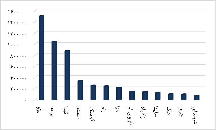 این تمرکز بالا در مصرف باتری خودرو توسط تعداد محدودی از مدلها، امکان سنجش دقیقتر بازار و تنظیم استراتژیهای تولیدی متناسب با نیازهای مشخص شده را فراهم میآورد. با این دادهها، تولیدکنندگان میتوانند بازدهی خود را افزایش داده و برنامهریزیهای بازاریابی خود را دقیقتر انجام دهند، ضمن اینکه درک بهتری از پویاییهای بازار کسب میکنند. در ادامه نموداری از خودوهایی با بالاترین سایز بازار باتری خودرو را برای شما به نمایش در میآوریم: