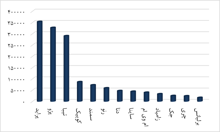 این تمرکز بالا در مصرف شیشه و آینه خودرو توسط تعداد محدودی از مدلها، امکان سنجش دقیقتر بازار و تنظیم استراتژیهای تولیدی متناسب با نیازهای مشخص شده را فراهم میآورد. با این دادهها، تولیدکنندگان میتوانند بازدهی خود را افزایش داده و برنامهریزیهای بازاریابی خود را دقیقتر انجام دهند، ضمن اینکه درک بهتری از پویاییهای بازار کسب میکنند. در ادامه نموداری از خودوهایی با بالاترین سایز بازار شیشه و آینه خودرو را برای شما به نمایش در میآوریم: