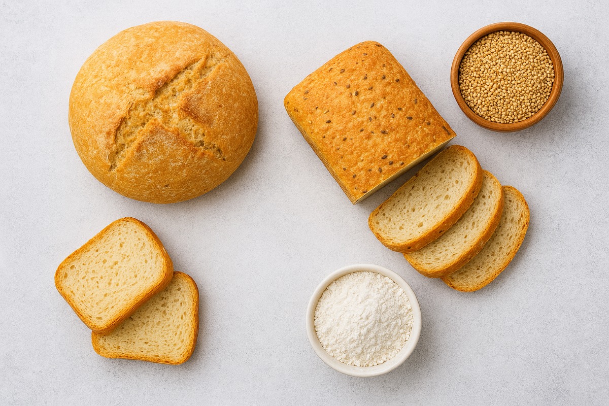 آرد کامل، آرد بدون گلوتن (ذرت، برنج، کینوا)، فیبر، امولسیفایرها