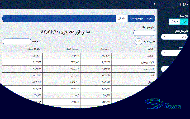 همانگونه که میدانید، محاسبه اندازه بازار امری سخت و در بسیاری از مواقع پیچیده است. در این راستا تیم متخصص اس دیتا، داشبوردی را برای شما عزیزان طراحی کرده است که با استفاده از آن میتوانید به راحتی اندازه بازار خود را محاسبه کرده و استراتژیهای مناسبی را برای فروش محصولات یا خدمات خود اتخاذ نمایید. در این داشبورد جمعیت ایران بر اساس استانها، محل زندگی، جنسیت، درآمد، سن و ... تفکیک شده است که شما عزیزان بتوانید به راحتی سایز بازار خود را اندازهگیری کنید. بعلاوه برای انجام تحقیقات بازار خود میتوانید به متخصصان اس دیتا مراجعه کرده و با آنها در این خصوص مشورت نمایید.