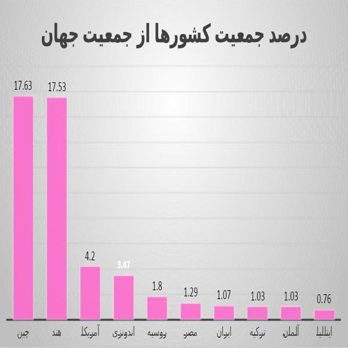 در نمودار زیر برایتان درصد جمعیت کشورها را آوردهایم. براساس این نمودار کشور چین حدود ۱۷.۶۳ درصد و هند ۱۷.۵۳ درصد از جمعیت کل جهان را در خود جای دادهاند. به طور کلی این دو کشور جهان ۳۵ درصد از جمعیت کل جهان را شامل میشوند. در این بین کشور ایران نیز تنها ۱.۰۷ درصد از جمعیت جهان را دارا است.