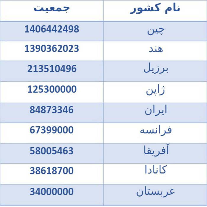 در جدول زیر ما تعدادی از کشورهای جهان با جمعیتشان در سال ۱۴۰۰ را برای شما آوردهایم. در این جدول پرجمعیتترین کشور جهان با ۱۴۰۶۴۴۲۴۹۸ نفر چین است. پس از آن هند کشور هفتاد و دو ملت با جمعیت ۱۳۹۰۳۶۲۰۲۳ نفر قرار دارد. کشور ایران با جمعیتی حدود ۸۴۸۷۳۳۴۶ نفر در رتبه هفده کشورهای پرجمعیت جهان را به خود اختصاص داده است.